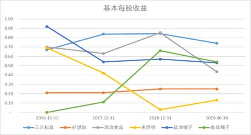 与此同时,盐津铺子和来伊份的数据则有些令人担忧。盐津铺子的基本每股收益在2016年到2017年期间从0.92元的高值减少到0.54元,2018年略有回升,为0.57元。其净资产收益率在近两年内也处于比较平稳的状态。