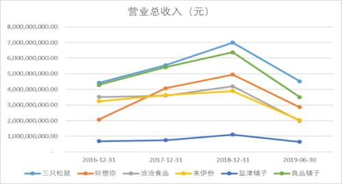 根据《每日财报》的统计,营收前三名的是三只松鼠、良品铺子以及好想你,2018年营收收入分别是70.01亿元、63.78亿元以及49.49亿元;2019年上半年营收分别是45.11亿元、35.05亿元以及28.57亿元。