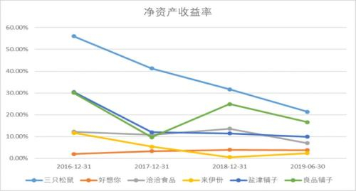 总体上看,盐津铺子的基本每股收益在几家企业中的排名并非很不理想,相比之下,来伊份的成绩就更加令人唏嘘。从2016年排名第三的0.69元一路走低,到2018年的0.03元,此时的来伊份已处于各个企业的末位。2019年半年报中披露的来伊份的基本每股收益为0.13元,数据上有所回升,但依旧处在几家企业的最后一位。同时,2018年来伊份的净资产收益率已跌至0.54%,几乎破零,这也让人对来伊份的盈利能力产生了质疑。