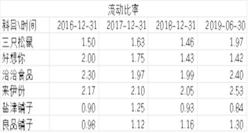 不仅如此,来伊份的速动比率在2016年和2017年也保持在1以上,2018年时略低,为0.96,但依旧领先于其他企业。这说明来伊份的运营能力和偿债能力良好。