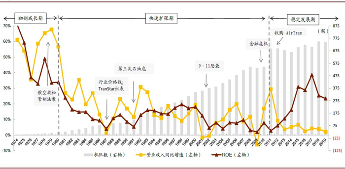 西南航空的发展并非一帆风顺,但是在近半个世纪的发展历程中,我们看到了低成本模式经营的韧性,特别是在经济下行叠加行业下行的周期中,以低成本模式经营的西南航空得以凭借成本优势,始终保持盈利。我们综合西南航空自身发展及外部环境变化将公司历程分为三个阶段:初创成长期(1967-1979)、快速扩张期(1980-2009)、稳定发展期(2010-至今)。