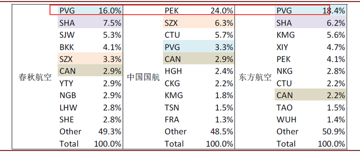图表: 截至2019年春秋VS国航、东航前十大基地对比(ASK口径)