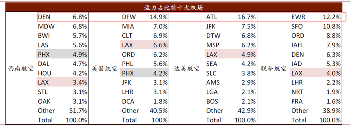 图表: 截至2019年美国四大航前十大基地对比(ASK口径)