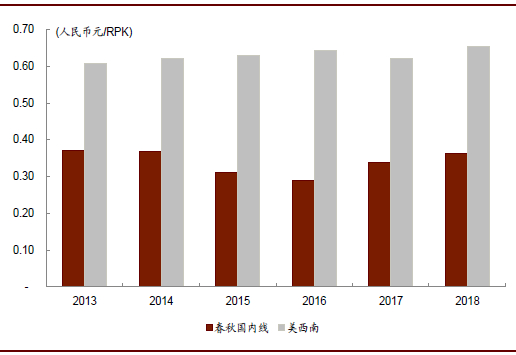 图表: 美西南VS.春秋国内单位收入(客运收入/RPK)对比