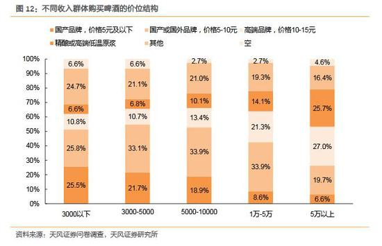 收入越高的消费群体,会减小低端啤酒的购买,转而倾向于消费高端品牌、精酿或者高端低温原浆。一二线城市的啤酒消费以高端为主,而三四五线城市则以低端为主。啤酒行业高度集中,价格战激烈,随着啤酒行业增速低迷以及消费观念的转变,行业低价竞争策略难以为继,结构升级成为企业发展的主要着眼点。随着人均可支配收入的不断上涨加之人民消费意识的改善,人们更加青睐高档化个性化的产品,消费观念的升级驱动啤酒向高端化发展。