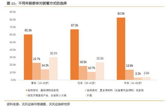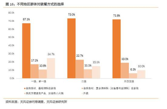 城市发展程度越高在家就餐的比例越低,外卖最受一线、新一线城市消费者青睐。一线、新一线城市自购食材在家做的比例无论是使用基础调料还是符合调料均低于二线城市和三四五线城市,一线、新一线城市使用基础调料在家做的比例只有67.1%,使用复合调料在家做的比例只有17.2%。二线城市自购食材在家做的比例要高于三四五线城市,二线城市使用基础调料在家做的比例达到73%,使用复合调料在家做的比例达到22.7%。外卖在一线、新一线城市中占比最高,达到25%,这与一线、新一线城市生活节奏快,空余时间较少有关,上线城市外卖市场空间较大,同样与外卖产业相关的辅餐类调味品有较大增长空间。