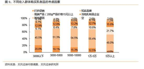 高收入水平群体更倾向于挑选知名品牌和高品质产品,对价格的敏感性降低。随着收入水平由3000元以下提高到5万元以上,购买牛奶或者酸奶这类乳制品时考虑价格折扣的比例从20.8%逐渐降低到4.6%,说明收入水平越高的消费群体对产品价格的敏感度越低。与此同时对产品知名度和品质的追求逐渐提高,月收入低于5万的消费者随着收入水平的提高更重视品牌知名度和产品品质,月收入为1万-5万的消费群体最看重知名品牌,在购买牛奶或者酸奶这类乳制品时考虑知名品牌的比例高达55.4%,月收入高于5万的消费群体对高端产品的重视程度有一个显著提高,他们在购买这类乳制品时考虑高端产品的比例高达21.7%,仅仅是知名品牌已经不能满足这类群体对乳制品消费的需求。