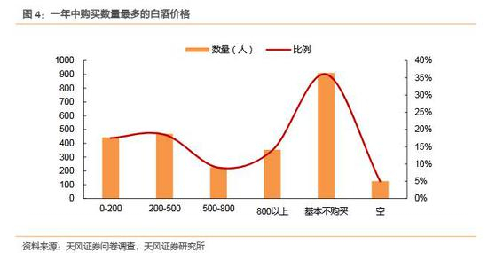 近四成消费者不自主购买白酒,次高端白酒最受青睐。调研结果显示,有36.1%的消费者基本不购买白酒,主要原因为调研样本以18岁-40岁的青壮年为主,整体年龄结构相对于白酒主力消费群体偏低。在自主购买白酒的消费者群体中,有27.5%选择购买次高端白酒(价位在200-800元),有17.5%选择购买低端白酒(价位在200元以下),高端白酒(价位在800元以上)的购买人数较低,只有14%。