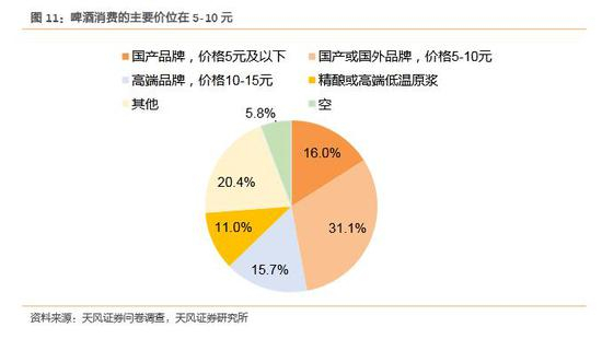 目前啤酒消费还是以中低端品牌为主,产品高端化之路仍长。近半数消费者购买的啤酒价格低于10元,主要价位在5-10元。购买价位在10元以下的啤酒的消费者比例为47.1%,将近占整体的一半,其中购买国产品牌,价格在5元及以下的消费者占16%,购买国产或国外品牌,价格在5-10元的消费者占31.1%。购买高端品牌,价格在10-15元的消费者占整体的15.7%,略低于购买价格5元及以下的消费者比例,购买精酿或者高端低温原浆的消费者比例最低,只有11%。