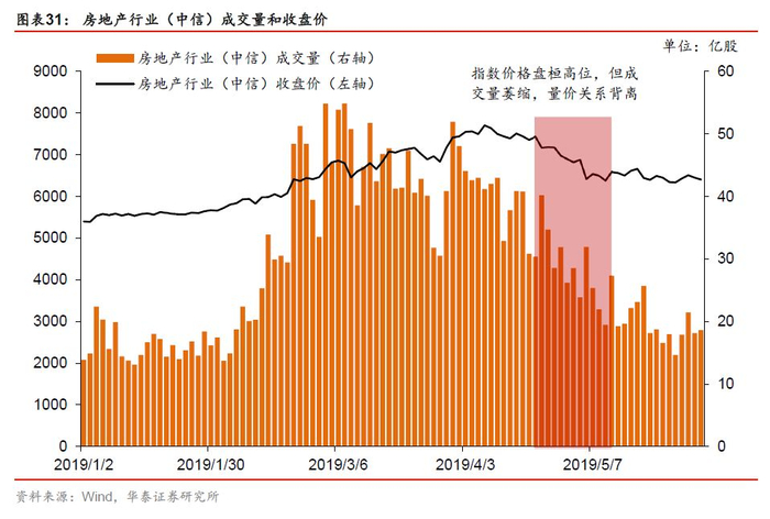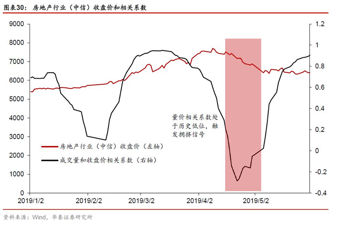 我们举例说明拥挤度指标在和景气度指标复合时所起到的规避风险作用:2019年初房地产行业景气度相对较高,被景气度策略选中,行业指数量价齐升。到了2019年4月中下旬房地产指数仍然盘桓高位,但是成交量不断萎缩,量价走势出现背离。量价相关系数在4月22日处于历史低位,触发拥挤信号,提示市场当前风险较大。在4月末房地产行业指数出现回调,如果依照拥挤度指标进行提前清仓,就可以减小下跌损失。