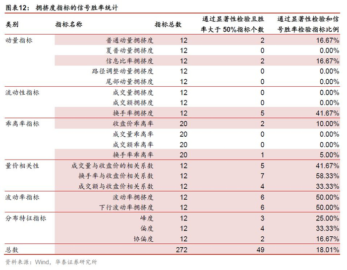 本小节将进一步借助信号胜率检验筛选能够预测未来出现下跌的拥挤度指标。拥挤度信号胜率定义为触发拥挤度信号之后一个月行业指数收益率为负的天数占比。拥挤度胜率越高,证明通过拥挤度指标识别出来可能出现下跌的信号越多。我们统计了每类拥挤度指标中拥挤度信号胜率大于50%个数占比。计算结果显示,包含所有参数设定的272个指标中,只有18%的指标同时通过显著性检验和信号胜率检验。量价相关性、波动率指标和分布特征指标信号更容易通过胜率检验,比其他三类指标更容易识别出可能出现下跌的行业指数。