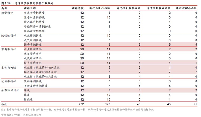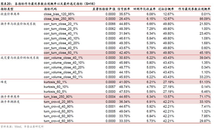 我们将过拟合概率小于50%作为过拟合检验的通过标准,计算结果显示:总计20项拥挤度指标中,有9项指标的回测过拟合概率在50%以下。最终通过显著性检验、信号胜率检验、回测收益检验以及过拟合检验的指标总共有6项:换手率拥挤度、收盘价乖离率、换手率乖离率、成交量与收盘价的相关系数、换手率与收盘价相关系数、峰度。在考虑参数设定之后,总共有21个拥挤度指标通过检验。