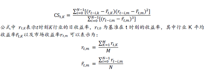 进一步地,我们还引入协偏度(coskewness)考察行业收益率相比于全市场整体收益率概率分布的偏离程度,行业K在t时刻相对于市场基准的协偏度为: