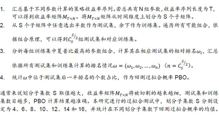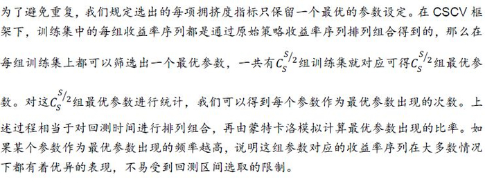 举例来说,在计算普通动量拥挤度时,需要引入窗口期长度和历史分位数阈值两个参数,取值范围分别是[20/40/60]日以及 [80%/90%/95%/99%],我们在回测过程中发现窗口期长度为20日、历史分位数阈值设定为99%时,普通动量拥挤度策略的回测年化收益率最高。对于普通动量拥挤度指标来说,20日和99%这组参数作为最优参数的过拟合概率具体有多大,可以通过CSCV方法进行定量验证,具体计算流程如下:
