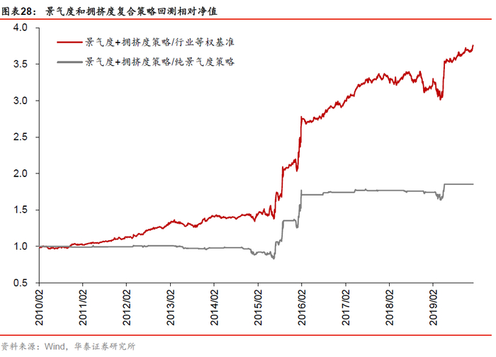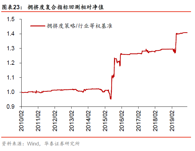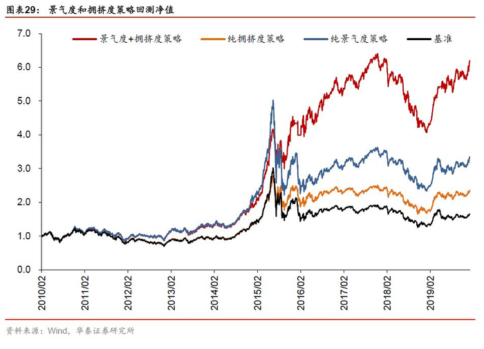 景气度和拥挤度复合策略相比于纯景气度策略有着稳定的超额收益。拥挤度指标为景气度策略带来的超额收益主要在2015、2016年以及2019年初,在这三个时段可以借助拥挤度指标有效规避下跌风险。
