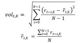 波动率就是股票价格的风险,一般用股票收益率的标准差进行表征。股票市场普遍存在低波动异象,长期来看低波动率的股票相对高波动率的股票具有更高收益。从拥挤度角度来看,如果行业指数短期的波动率急剧上升,说明股票风险加大,在投资过程中应该规避。行业K在t时刻的波动率可以表示为: