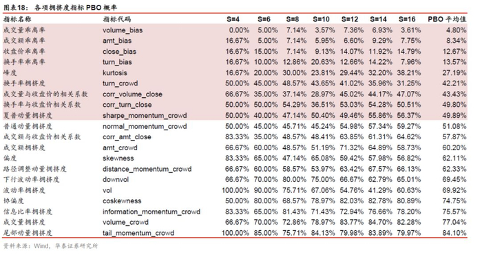 如果某个拥挤度指标的PBO高,说明训练集中表现好的参数在测试集中往往表现较差,意味着这个指标的参数设定过程存在较大的过拟合风险。指标的PBO越高,过拟合风险越大。我们会对需要设置参数的20项拥挤度指标进行过拟合概率计算,在保证有效性的同时寻找过拟合概率较低的拥挤度指标。