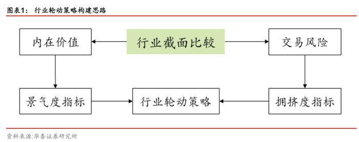 在微观层面的行业轮动研究中,我们致力于通过行业截面比较的思路寻找短期机动型配置机会,从自下而上的角度挖掘行业基本信息,寻找行业层面的超额收益。具体而言,我们将从行业的内在价值和交易风险两个角度构建有行业选择能力的指标,并且关注多个指标复合后的效果,减少单项指标回测结果的偶然性。在行业轮动策略研究中,我们主要从景气度和拥挤度两个角度进行行业指标的构建: