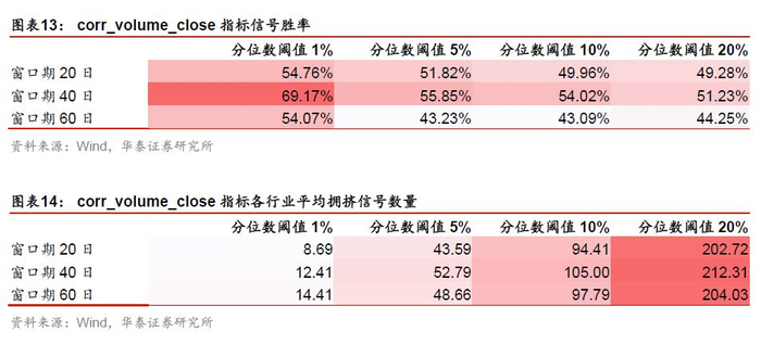 对单项景气度指标来说,参数的选取对于信号胜率的影响存在一定的规律。以成交量和收盘价相关系数指标为例,历史分位数阈值越低,对应的信号胜率越高,更容易识别出未来会出现下跌的情形。一般情况下,如果拥挤度指标分位数阈值设定越接近极端情况(比如正向指标趋向于1%,负向指标趋向于99%),信号胜率越高。不过分位数阈值取值过于极端会导致发出的拥挤度信号变的很少,致使指标失去应用价值。具体的参数取值还要结合回测检验以及过拟合检验进行对比分析。