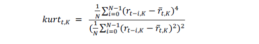 峰度用来描述数据概率分布顶端尖峭或扁平的程度。峰度越大,代表分布越集中;峰度越小,分布越平滑。如果过去一段时间日收益率峰度越低,说明收益率取值较为分散,短期市场波动率更高,风险更大,拥挤度更高。行业K在t时刻的峰度(kurtosis)为: