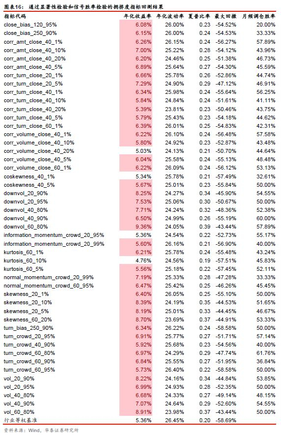 回测结果显示,通过了显著性检验和信号胜率检验的拥挤度指标,回测年化收益率普遍能够超越行业等权基准。前两个过程筛选出的总计49个拥挤度指标中,有45个可以取得正超额收益。通过检验的指标中量价相关性指标和波动率类指标居多。回测表现最好的是downvol_60_80%指标,能够取得接近4%的年化超额收益。