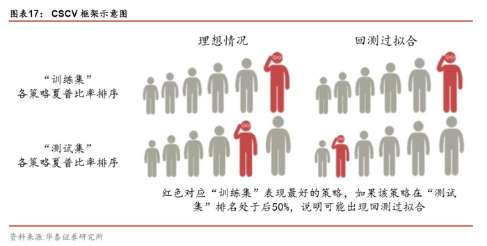 在华泰金工人工智能系列报告(《基于CSCV框架的回测过拟合概率》,2019-6-17)中,我们引入了组合对称交叉验证(CSCV)框架计算策略的过拟合概率(PBO),对策略过拟合程度进行定量分析。PBO概率定义为:样本内最优参数在样本外的夏普比率排名位于后 50%的概率。一般情况下PBO概率小于50%可以认为过拟合概率不高。PBO越小,回测过拟合概率越低。