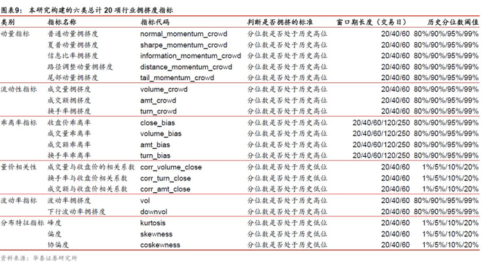 后文中,拥挤度指标的命名方式为:指标代码+窗口期长度+历史分位数阈值。比如说normal_momentum_crowd_20_80%表示当过去20日普通动量历史分位数大于80%,且行业指数涨跌幅为正时,判定当前行业处于拥挤状态。