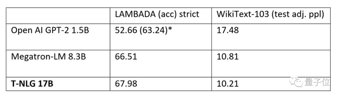模型预训练完成后,他们也在WikiText-103(越低越好)和LAMBADA(越高越好)数据集上,与英伟达Megatron-LM和OpenAI的GPT-2完整版进行了比较,都达到了最新的水平。