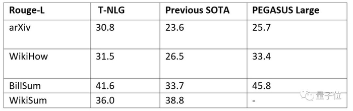 他们与另一个最新的基于Transformer的语言模型PEGASUS,以及先前最先进的模型进行了比较,ROUGE评分结果如下,基本上实现了超越。