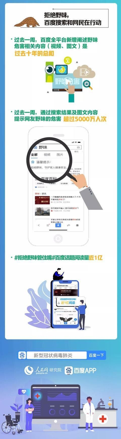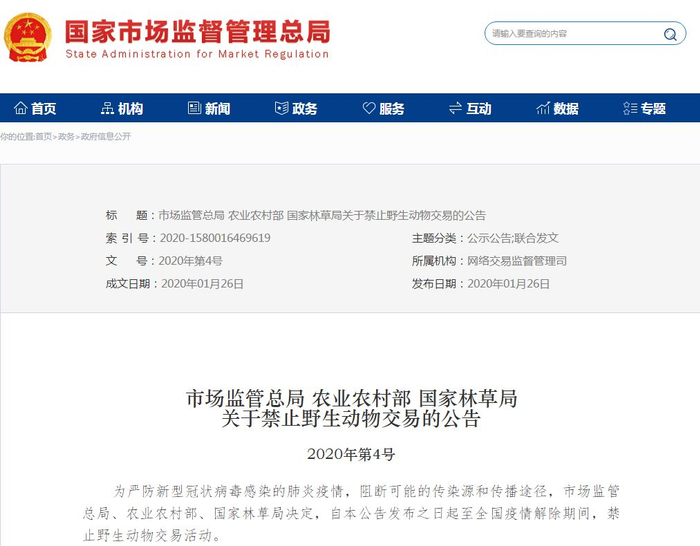 为阻断可能存在的传染源和传播途径,市场监管总局联合农业农村部、国家林草局于1月26日发布《关于禁止野生动物交易的公告》。公告发布后,社会各界反响强烈,新浪相关微博话题一天阅读量即接近3亿次,中央电视台、人民网、新华网等主流媒体纷纷予以报道。