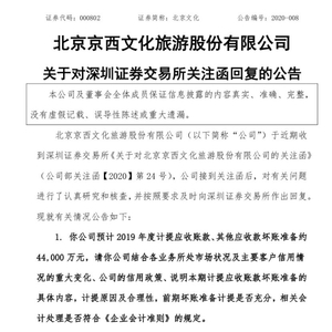 深交所要求,北京文化对导致公司2019年亏损的3大原因,包括计提坏账4.4亿、存货跌价0.4亿、商誉减值13.7亿至14.7亿,进行更为详细的说明。