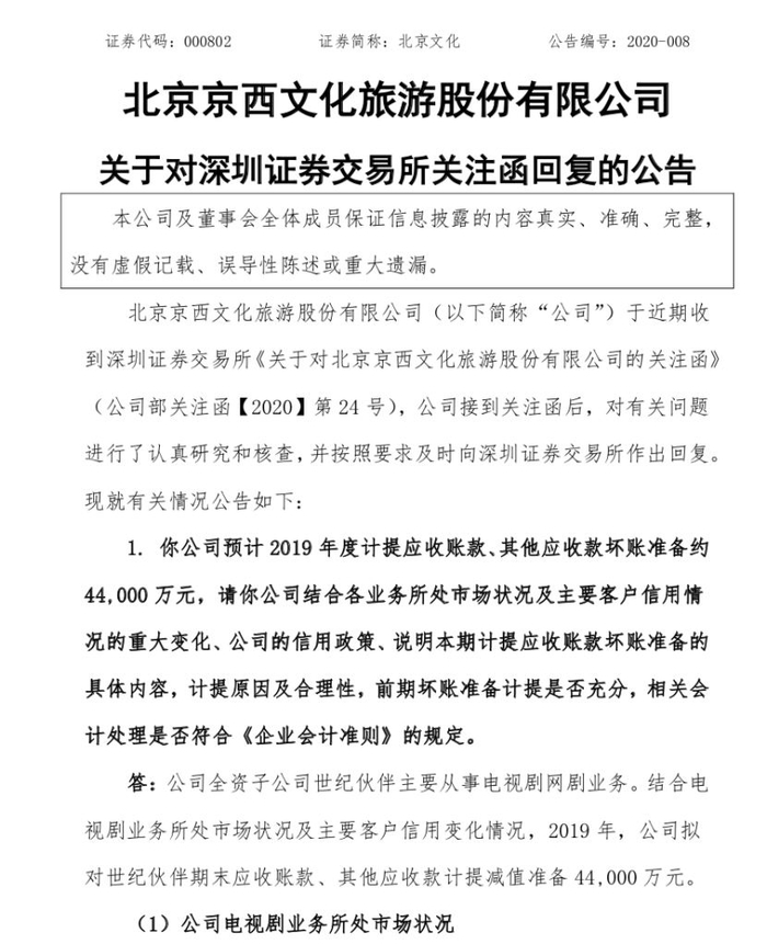 北京文化解释称,公司拟对世纪伙伴期末应收账款、其他应收款计提减值准备4.4亿元,主要有以下两方面的原因。