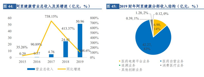 2019 财年,阿里健康实现营业总收入50.96 亿元,同比增长 108.6%,其中医药自营业务收入保持强劲,实现收入 42.27 亿元,同比增长 91.3%,占营业总收入的 83%左右;
