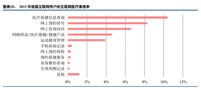 医药电商和互联网建康管理使用率分别占到网民的 4.6%和 3. 9%;而在慢病管理、预约体检、健康保健等 O2O 医疗健康领域,使用率都低于 1%。