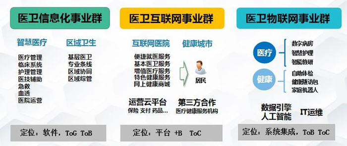 公司成功组建了医卫信息化事业群、医卫物联网事业群、医卫互联网事业群,形成了“一体两翼”的公司业务格局,为公司医疗健康大数据运营、健康城市建设运营、互联网医院建设运 营、智慧医疗物联网服务运维等创新业务进一步发展奠定了坚实的基础。