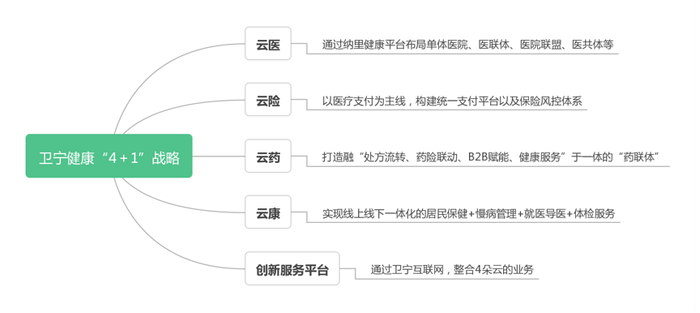 公司自2015年起,积极布局医疗健康服务领域,推动互联网+模式下的医疗健康云服务等创新业务的发展,现已形成“4+1”发展战略(云医、云药、云险、云康+创新服务平台)。
