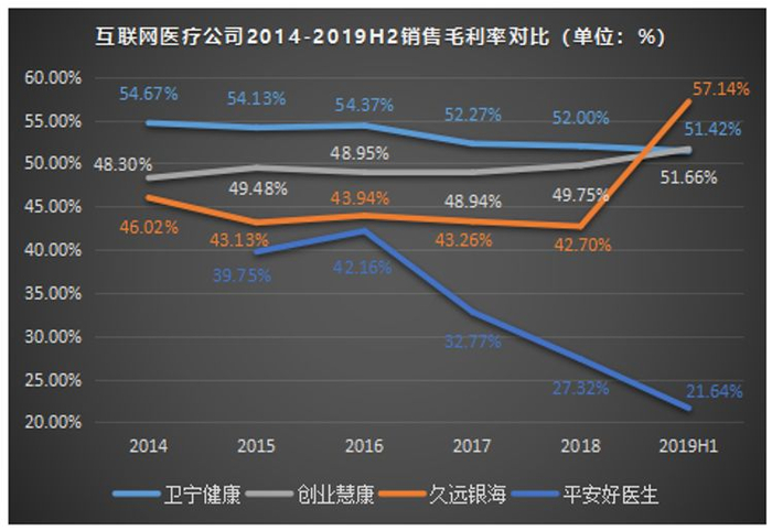 但是,由于这三项毛利率最高的业务占总营收的比重不高。另外,影响互联网医疗企业毛利率水平的主要因素是期间费用成本支出。而平安好医生由于主要把资金花在销售费用和管理费用上,所以整体来看,公司的毛利率水平不高。