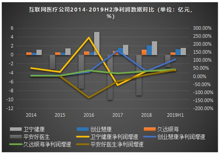 尽管总营收少于平安好医生,但是净利润是四家公司里最多的,2018年为3.03亿元,而且增长速度一直保持稳定状态。2020年1月22日,卫宁健康还发布了2019年的业绩预告,“预计2019年度归属于上市公司股东的净利润3.8亿元至4.41亿元,同比增长约25%-45%。”可见其业绩一如既往的保持稳定。