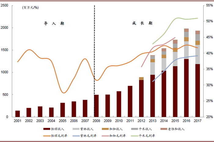 ►恒顺醋业:2008年至今,恒顺一边继续做大传统的镇江香醋产品,另一方面开始拓展新品类。积极推出“三年陈”、“六年陈”来攻占香醋的高端市场,在山西实现异地产能扩张,进军陈醋市场。此外,恒顺还相继拓展白醋、米醋、果醋、酱油、料酒等,品类圈大大扩张。在这一过程,协同效应明显,高端醋放量推高盈利,公司食醋业务与总体的毛利率从2011年的32%持续提升至2017年的41%。