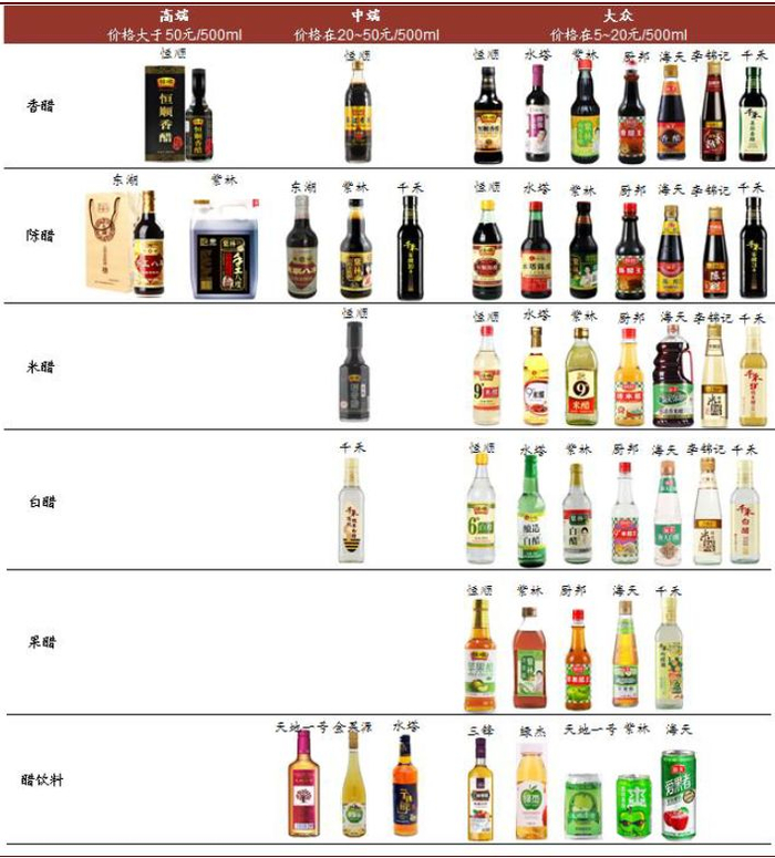 低档(大众)的价格带在5~20元/500ml,市场规模最大,一是品种多,“香陈米白果饮”均有,二是玩家多,基本上所有做醋的企业都有布局。