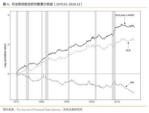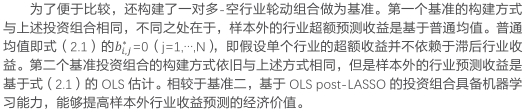 与完整模型的OLS估计相比,LASSO将很多“不重要”系数设置为零,从而降低了数据中的噪声,更好地识别滞后行业收益中的预测信号。然而,正如前面所讨论的,对于LASSO选择的预测因子,LASSO倾向于过度收缩全模型的OLS系数估计值。OLSpost-LASSO估计使收缩程度更局限,平均来看,在LASSO选择预测值时,只比一个全模型OLS估计小15%(量级)。综上所述,为了避免过度收缩以及过拟合的问题,采用OLS post-LASSO估计可以更准确地测量滞后行业收益中的预测信号。