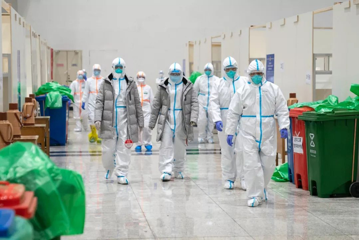 2月5日,身穿防护服的医生走入武汉汉江方舱医院,首个方舱医院开始收治病人。新华社记者 熊琦摄