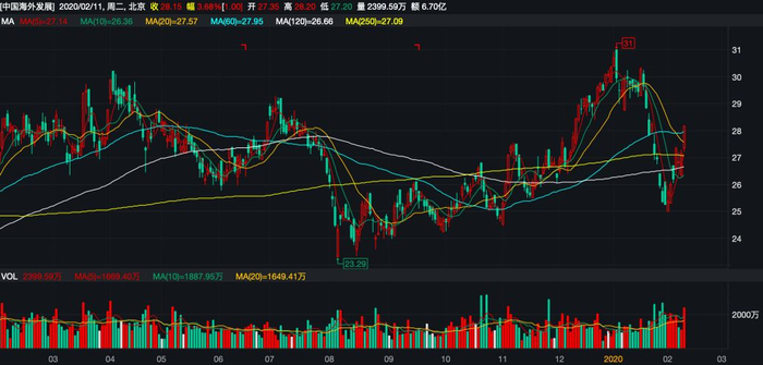 中国海外发展近一年股价走势