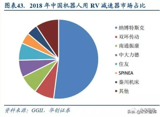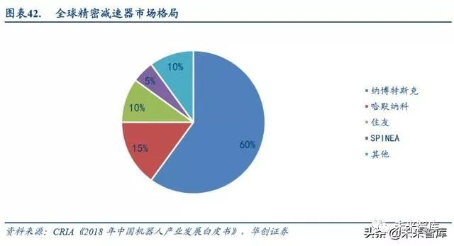 精密减速器制造因其对材料、设备、工艺等多个环节都有严格要求,而造成极高的投资和技术壁垒。正因如此,当 前全球工业机器人减速器市场呈寡头垄断格局,行业集中度较高。其中,日本纳博特斯克(Nabtesco)是生产 RV 减 速器的世界巨头,约占 60%的全球减速器市场份额,在中/重负荷工业机器人领域,其 RV 减速器产品在全球 RV 减 速器市场占有率更是高达 90%以上。哈默纳科(Harmonic)则在谐波减速器领域拥有绝对优势,约占 15%的全球减 速器市场份额。除此之外,住友市场份额也有 10%,旗下产品包括 FINECYCLO 系列零齿隙精密摆线减速器等。全 球减速器市场呈现出以日本企业一派独大的高度集中化局面。