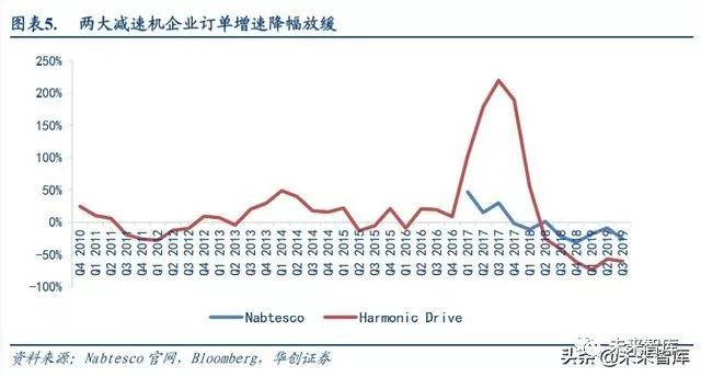 两大减速器公司订单增速降幅收窄。减速器作为工业机器人最重要的上游零部件,占据工业机器人总成本的 35%, 并且全球市场份额的 75%被日本纳博特斯克(Nabtesco)和日本哈默纳科(Harmonic Drive)两个公司所占据。这两 个公司的订单数据对机器人行业的景气度具有一定的预示作用。从两家订单增速可以看到,相继于 2018Q4 和 2019Q1 出现拐点,降幅收窄。