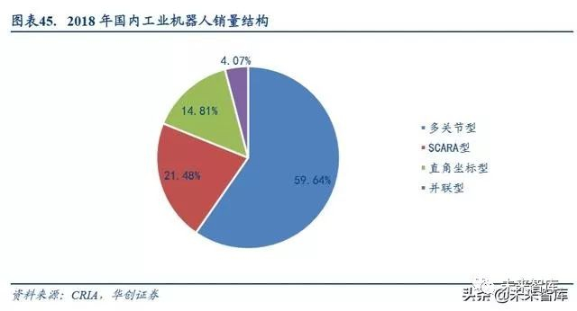 工业机器人本体按照坐标形式可分为直角坐标型、SCARA 型、多关节型、并联型等。在各种类型工业机器人中,多 关节型与 SCARA 型用量最大,应用领域最为广泛。从市场结构看,多关节机器人和 SCARA 机器人占工业机器人销 量的主要份额,其中多关节机器人的销量占比为 59.64%, SCARA 机器人的销量占比为 21.48%。