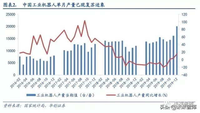 根据国家统计局公布,2019 年 12 月国内工业机器人产量 20014 台,同比增长 15.3%。国内工业机器人产量从 2018 年 9 月开始,受到宏观经济下行的影响,经历了连续 13 个月的下滑,自 2019 年 10 月转正,随后增速逐月增加。受 宏观政策的影响,下游制造业有所复苏,其对工业机器人的需求也恢复到正常水平,国内机器人行业转暖信号已经 浮现。