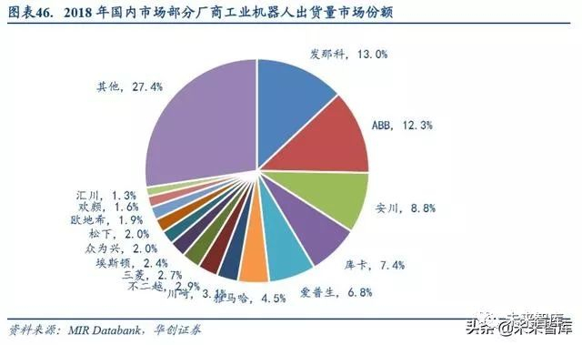 另外,市场份额仍较为分散且处于价值链偏低端,在汽车和 3C 等对于精度和稳定性要求比较高的领域,大部分市 场份额都是被外资品牌占据,我国大部分本体都是集中码垛、上下料以及搬运等相对低端的领域。根据 MIR Databank 数据,2018 年我国机器人自主品牌销量占比约为 27.72%。而根据中国机器人产业联盟数据,在主要下游应用领域电 气电子设备和器材制造业和汽车行业中自主品牌分别占比 30.1%和 13.8%,均有非常大的提升空间。