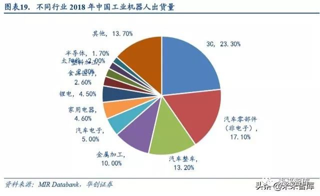 根据 MIR Databank 的统计,2018 年中国工业机器人出货量排名前几的下游应用领域主要包括汽车行业、3C、金属 加工、化工橡胶与塑料、食品饮料等行业。