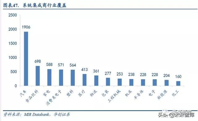 MIR Databank对7888家系统集成商中的5627家厂商进行了行业覆盖分析,其中1906家覆盖汽车行业,占比33.9%;698 家覆盖食品饮料行业,占比 12.4%;588 家覆盖家电行业,占比 10.4%;413 家覆盖医疗行业,占比 7.3%;571 家覆盖消费类电子行业,占比 10.1%(有些厂商会涉及覆盖多个行业)。